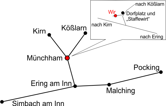 Nach ca. 3 km erreichen Sie Münchham. In Münchham rechts Richtung Kößlarn bis zum Dorfplatz.
